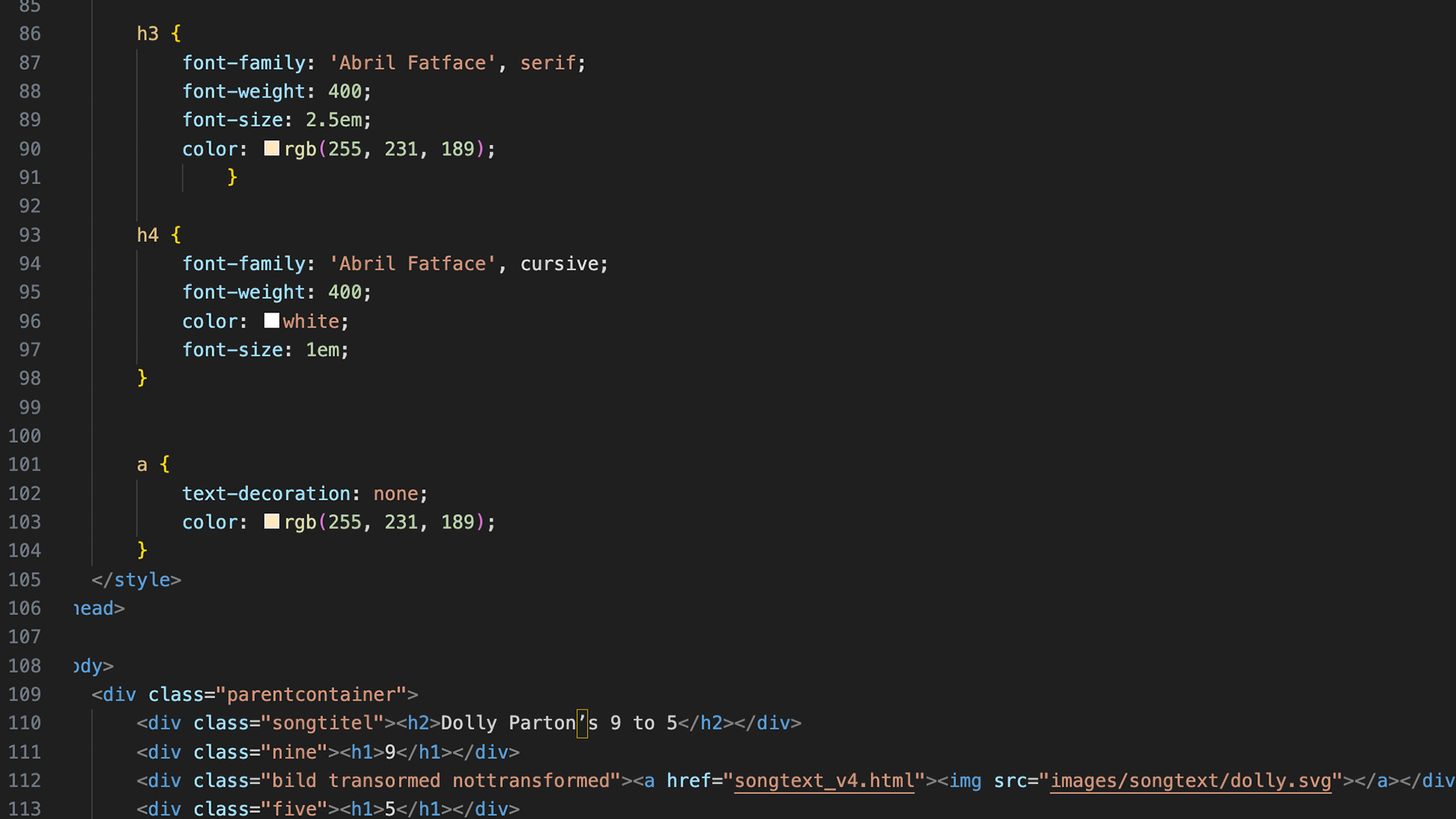 Grids & Modules - Interaktiver Songtext: In diesem Modul stand der strukturelle Aufbau von Webseiten im Mittelpunkt. Neben den technischen Grundlagen kodierte ich einen Songtext interaktiv: Dolly Partons “9 to 5” . Der Text wird durch animierte, dynamische Elemente zum Leben erweckt, die auf Benutzerinteraktionen reagieren. Zum Resultat